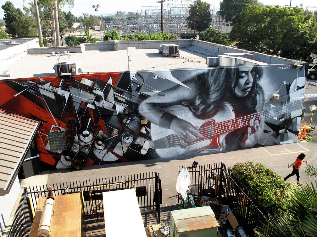 Here's some shots of a new mural I just painted with my good friend Kofie in LA. It was commissioned for the new Red Bull Sound Space venue at the KROQ headquarters. Coincidentally, I just painted a guitarist in Spain recently, so this is a more modern, harder, electric companion to that. This is based on a photo I took of my girl Kim playing her vintage Supro guitar. I wanted this to convey a sense of rocking out combined with musicianship- I think Kofie's sharp, aggressive angles are a good compliment to the more focused, serene feel of the figure. Music is a key part of my painting process, I hardly ever paint without listening to some kind of music...so this is sort of an appreciation for all the great musicians that help us do what we do and make life better, one drum beat or guitar riff at a time. Thanks to Kim for modeling, and all the good folks from KROQ and Red Bull that helped make this mural possible.